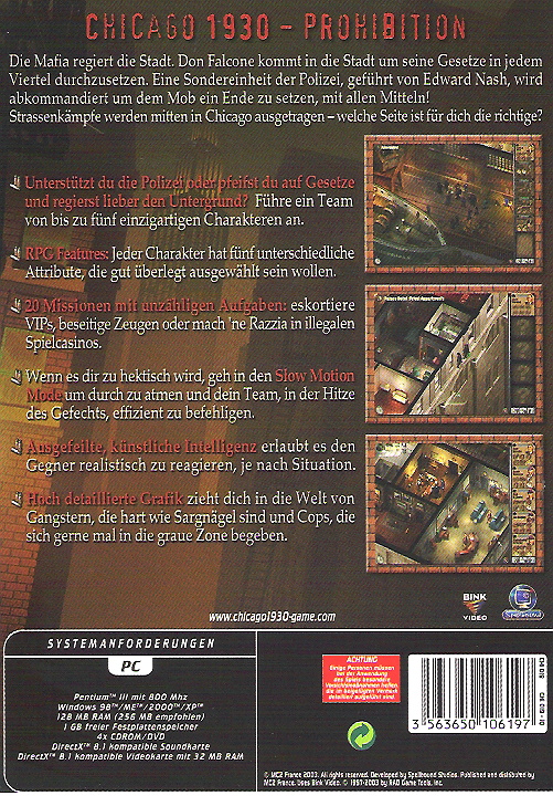 Düstere Machenschaften, Straßenschlachten und Alkoholverbot: Chicago 1930 entführt Hobby-Mafiosi und Möchtegern-Paten in die Zeit der Prohibition. Im Taktik und Infiltrationsspiel aus dem Erfolgshause Spellbound kämpfen Spieler auf Seiten des Gesetzes für Gerechtigkeit oder machen als Gangster die Stadt unsicher. Als erste Echtzeitstrategie mit faszinierendem Mafia-Background überzeugt Chicago 1930 durch authentisches 30er Jahre Flair und spannende Kampagnen, die auf historischen Ereignissen wie dem Valentinstag-Massaker von 1929 basieren.