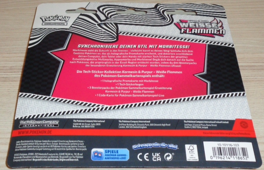 Morbitesse sieht die Zukunft in den Sternen - vielleicht kennt es deinen Weg! Schliesse dich dem Gestirns-Pokémon an, das als holografische Promokarte erscheint, und dekoriere anschliessend deinen Computer, dein Tablet oder dein Handy mit starken Tech-Stickern der gesamten Entwicklungskette: Mollimorba, Hypnomorba und Morbitesse! Begib dich danach auf die Suche nach Pokémon, die ursprünglich in der Einall-Region entdeckt wurden, indem du drei Boosterpacks der besonderen Erweiterung Karmesin & Purpur - Weisse Flammen öffnest!