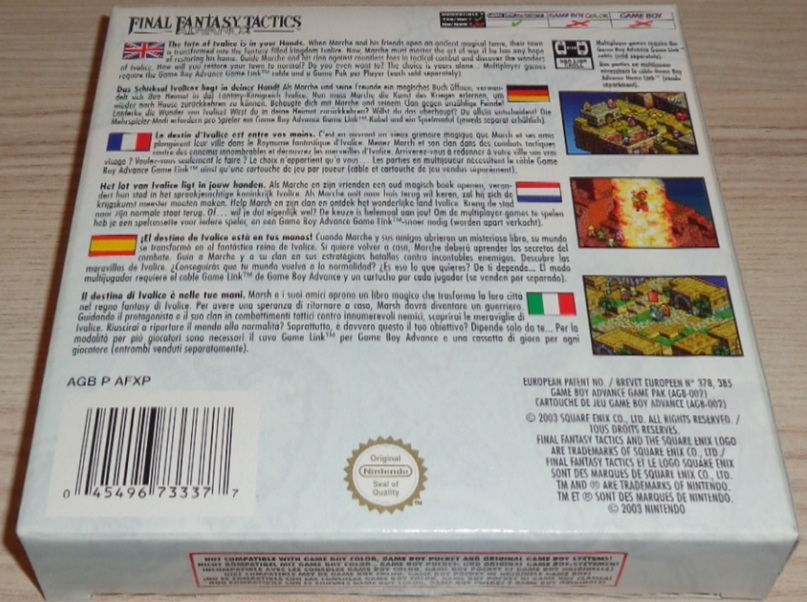 Die Welt von Final Fantasy kehrt auf Game Boy Advance zurück! Als Marche und seine Freunde Mewt und Ritz ein uraltes Buch öffnen, verwandelt sich ihre Kleinstadt St. Ivalice in ein Königreich der Schwerter und Zauberei, als Ivalice bekannt. Um seine Welt wiederherzustellen, muss Marche sich einem Clan anschliessen, das Schwert zur Hand nehmen, Magie erlernen und sich seinen Weg durch dutzende taktischer Schlachten kämpfen. Letztendlich ist es seine Aufgabe, das Rätsel der Kristalle zu lösen, jener magischen Steine, die der Schlüssel zur Wiederherstellung seiner Heimat sind. Befehlige eine Truppe von Kämpfern, Magiern und Monstern, um einen Plan zu entwerfen, mit dem du deine Feinde mit Schwertern, Magie und unglaublichen herbeigerufenen Monstern angreifst und besiegst, die das Markenzeichen aller Final Fantasy-Spiele sind.