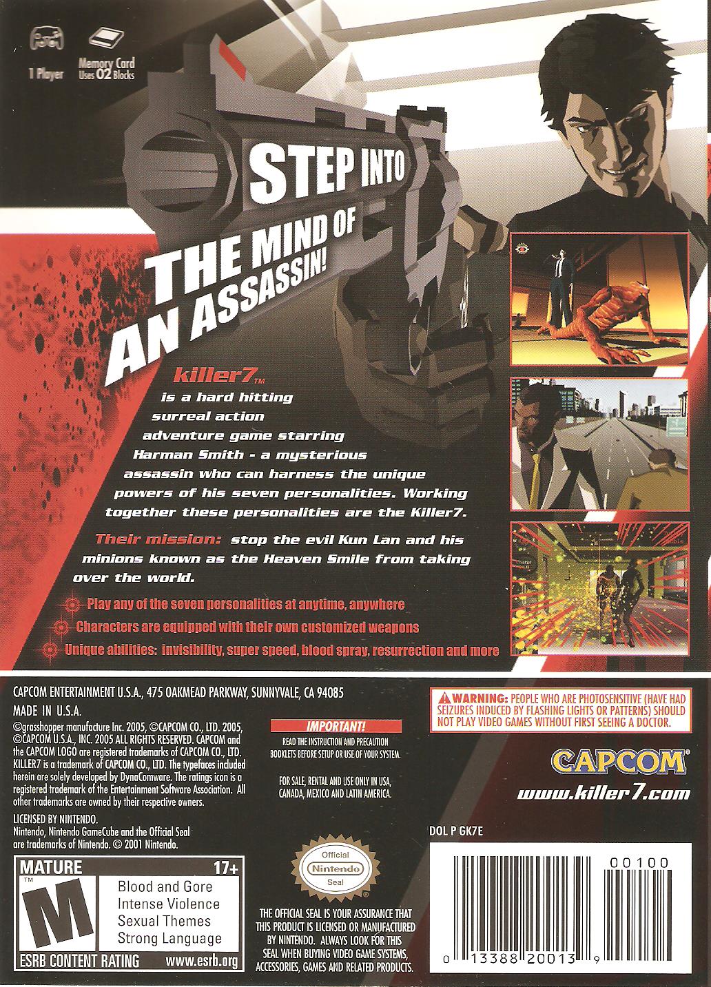 Von Shinji Mikami, dem Erfinder von Resident Evil und Devil May Cry. Sieben Killer mit ihren eigenen blutigen "Lebensläufen": Verschiedene Tötungstechniken, Waffen und versteckte Fähigkeiten. Riskiere einen Blick in den Verstand von Killer 7. Knallharter Comic Look, blutgetränkte Kämpfe, abgedrehte Puzzles. Töte oder werde getötet. Atemberaubende, verdammt schnelle Action: Ziele auf die Schwachpzunkte der Gegner und drück ab, bevor dich die Kreaturen in Stücke reissen.