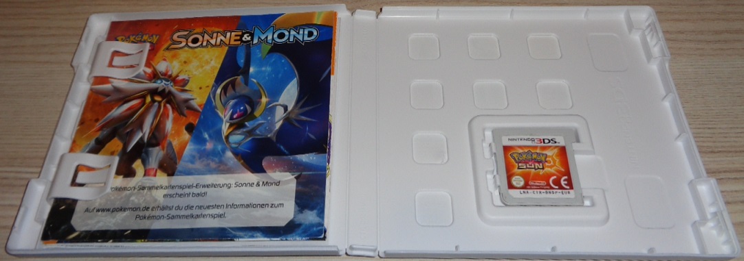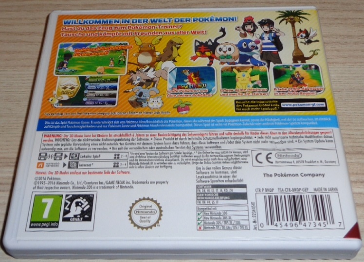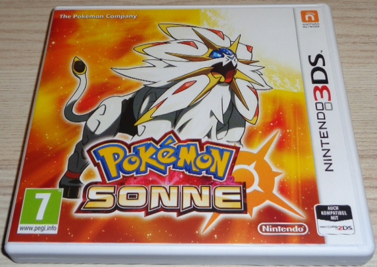 Dies ist das Spiel Pokémon Sonne. Es unterschiedet sich von Pokémon Mond hinsichtlich der Pokémon, denen du während des Spiels begegnen kannst, sowie der Häufigkeit, mit der sie auftauchen. Im Hinblick auf Kämpfe und Tauschmöglichkeiten sind nur Pokémon Sonne und Mond miteinander kompatibel. Dieses Spiel ist nicht mit Pokémon-Zubehör oder anderen Pokémon-Spielern kompatibel.