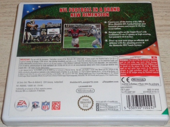 Madden NFL Football for the Nintendo 3DS brings your favorite players and teams to life like never before, in jaw-dropping 3D. The action jumps off the screen as you compete in traditional 11-on-11 games or high-flying 5-on-5. Whether you're a Madden NFL rookie or an All-Pro, three types of playcalling options provide the right amount of depth for every player. Harness the power of the 3DS Touch Screen and draw your own plays right on the field with the innovative Call Your Shots feature. Madden NFL Football is the ultimate sports experience for the Nintendo 3DS.