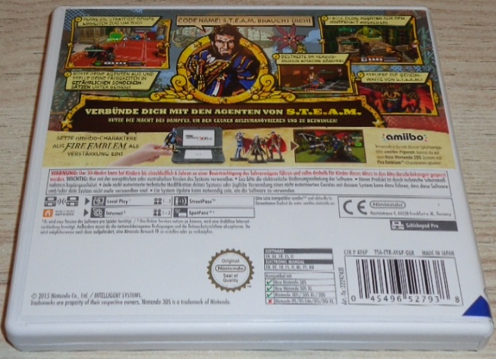 Jeder Spielzug muss wohl überlegt sein, denn alle Kampfhandlungen sind vom geschickten Einsatz des kostbaren Vorrats an Dampfkraft abhängig. Die direkte Kontrolle über das Team per Third-Person Perspektive ermöglicht ausgefeilte taktische Manöver. Dabei sind gezielte Angriffe aus sicherer Deckung ebenso überlebenswichtig wie der Einsatz mächtiger Wache-Konter Attacken, die den Gegner automatisch vom Vorrücken abhalten. Jeder Agent besitzt einzigartige Talente und Angriffsmöglichkeiten, welche sich mit einer Auswahl an sekundären Waffen, die im Verlauf der Kampagne freigespielt werden, kombinieren lassen. Mehrspieler-Gefechte können online und im lokalen Mehrspielermodus auf speziell hierfür konzipierten Karten ausgetragen werden. Dabei stehen drei verschiedene Modi zur Auswahl: Death Match, Medaillenjagd und A.B.E.-Duell. Über StreetPass lassen sich Missionserfolge mit anderen Spielern vergleichen – der überlegene erhält wertvolle Medaillen für das Verbessern seines Teams. Berührt der Spieler mit einem Marth, Ike, Daraen oder Lucina amiibo den NFC-fähigen Touchscreen des New Nintendo 3DS oder New Nintendo 3DS XL können die legendären Fire Emblem Charaktere als spielbare Helden in den Kampf ziehen - ausgestattet mit ihren charakteristischen Waffen.