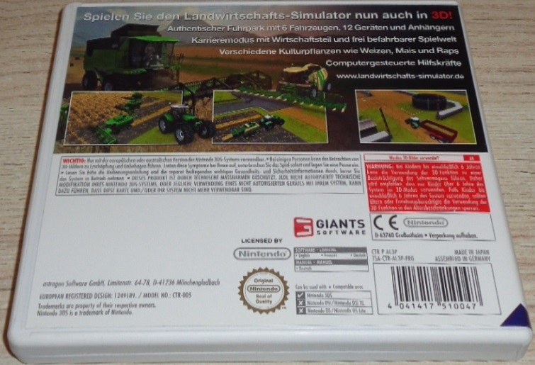 Die beliebte Landwirtschafts-Simulator-Reihe jetzt auch zum Mitnehmen auf dem Nintendo 3Ds. Riesiger Fuhrpark mit authentischen Landmaschinen von DEUTZ-FAHR, KRONE, HORSCH, PÖTTINGER, AMAZONE, LEMKEN und VOGEL & NOOT. Viele detaillierte Geräte und Anhänger. Vom Computer kontrollierte Helfer unterstützen Sie bei Ihrer Arbeit. Karrieremodus mit Management-Teil. Drei verschiedene Fruchtsorten: Mais, Raps und Weizen- Große frei begehbare Welt von 1 km² mit dynamischem Tag-Nacht-Wechsel.