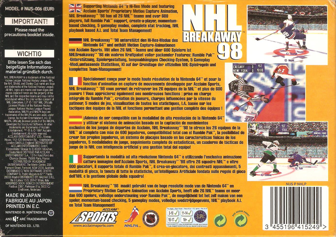 NHL Breakaway 98 unterstützt den Hi-Res-Modus des Nintendo 64 und enthält Motion Capture-Animationen von Acclaim Sports. Mit 26 Teams und 600 Spielern ist dieses Spiel ein wahres Kraftpaket.