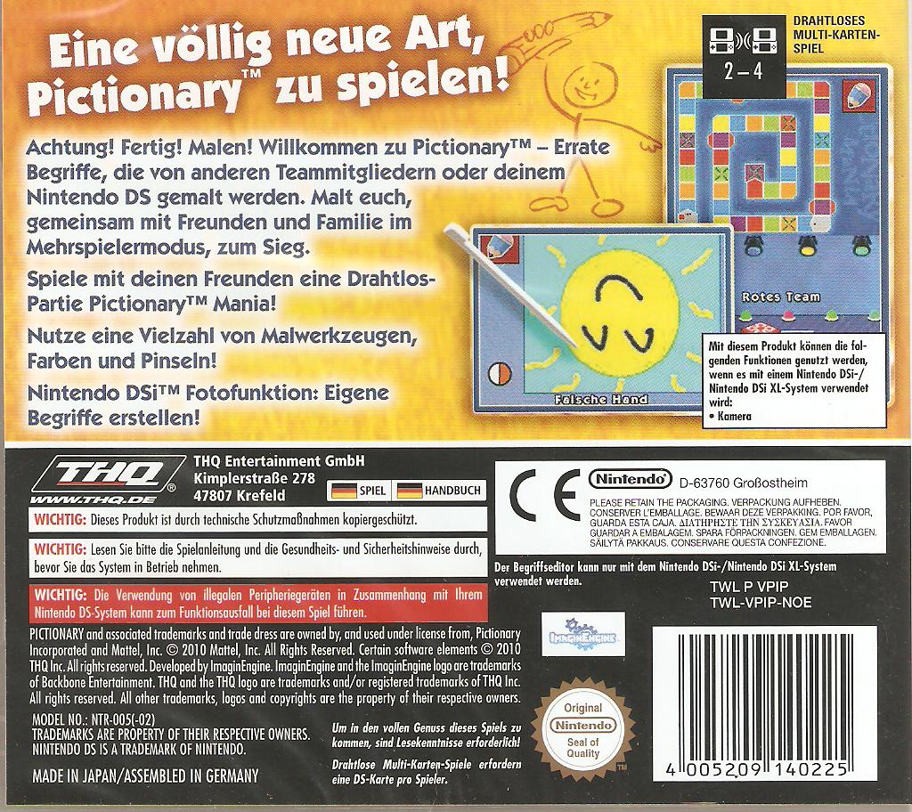 Eine ganz neue Art, um Pictionary zu spielen! Auf die Plätze - fertig - zeichnen! Willkommen zu Pictionary - einem Ratespiel, bei dem Sie erkennen müssen, was die Mitspieler in Ihrem Team zeichnen. Bei den gesuchten Dingen kann es sich um Objekte, Personen, Aktionen, Orte, Tiere oder auf Wunsch auch besonders schwierige Rätsel handeln! Sie müssen kein Künstler sein, um Pictionary spielen zu können. Alles was Sie dazu brauchen, ist etwas Vorstellungskraft!