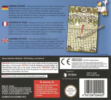 Die geliebte Henne Paula kommt zurück - als Huhn am Spieß auf dem Nintendo DS. Mit der optimalen Stiftkontrolle läuft Paula dabei zu neuen Spitzenleistungen auf und rettet zahllose gefangene Küken vor dem Suppentopf. Die erfolgreichen Charakteristika des PC-Originals finden sich auch in der Nintendo DS-Version wieder: Breakout-Prinzip, Magic-Ball-Charme und natürlich die Henne selbst. Dies läßt sich in Kombination mit der neuen ultimativen Stiftkontrolle, den über 50 extra für den Nintendo DS designten Level und den alten und neuen Specialfeatures wie Multiball, Ball am Gummiband und der berühmt berüchtigte Crazyball die Spielerherzen schneller schlagen. Chicken Attack bietet sowohl für Profi-Spieler als auch für Gelegenheitsspieler ausreichend Möglichkeiten sich auszutoben.