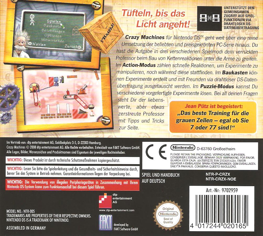 Crazy Machines für Nintendo DS geht über eine reine Umsetzung der beliebten und preisgekrönten PC-Titel der Crazy Machines-Serie hinaus. Mit dem neuen Crazy Machines hat der Spieler die Chance, neben dem bekannten Rätsel-Modus den völlig neuen Action-Spielmodus zu erleben. Im Action-Modus ist die Geschicklichkeit und Reaktionsgeschwindigkeit des Spielers gefragt: Bauteile müssen interaktiv im ablaufenden Experiment manipuliert werden, womit sich ein völlig neues Crazy Machines-Potential entfaltet. Ein weiterer Clou ist das Austauschen selbst erstellter Experimente per Wi-Fi mit anderen Spielern, um auszuspielen, wer der beste Tüftler ist.