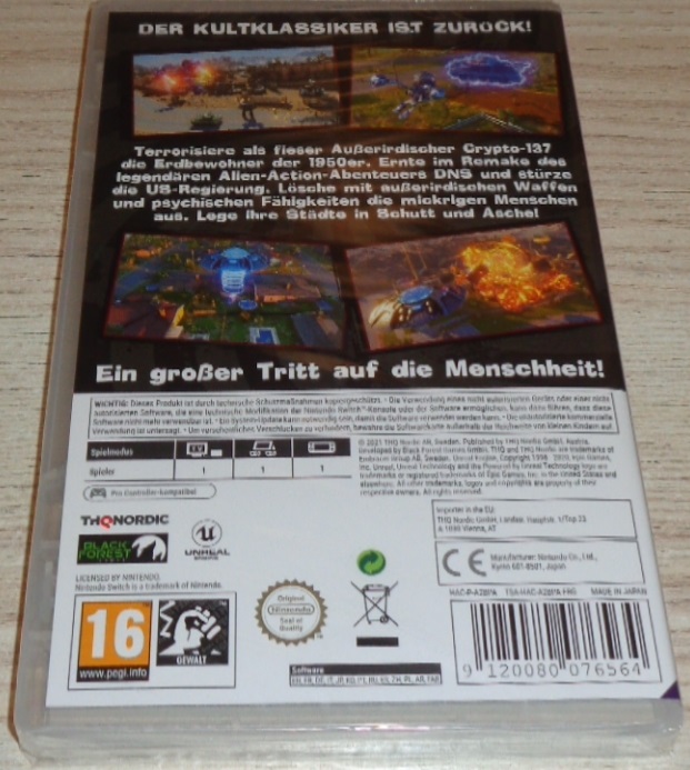 Terrorisieren Sie als fieser Ausserirdischer Crypto-137 die Erdbewohner der 1950er. Ernten Sie im Remake des legendären Alien-Action-Abenteuers DNS und stürzen Sie die US-Regierung. Löschen Sie mit ausserirdischen Waffen und psychischen Fähigkeiten die mickrigen Menschen aus. Legen Sie ihre Städte in Schutt und Asche. Ein grosser Tritt auf die Menschheit!