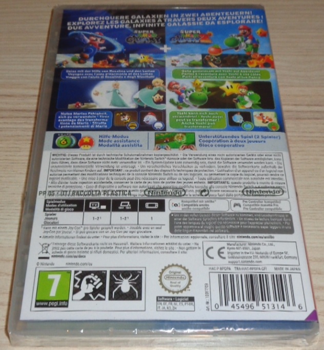 Verbesserte Grafik für beide Spiele. Schalte den Hilfe-Modus ein, um Unterstützung zu erhalten! So kannst du mehr Lebenskraft erhalten, durch blosses Stillstehen geheilt werden und bei Stürzen in die Tiefe automatisch auf festen Boden zurückkehren. Dieser Modus kann jederzeit ein- oder ausgeschaltet werden. Rosalinas Bilderbuch in Super Mario Galaxy umfasst jetzt ein neues Kapitel, und Super Mario Galaxy 2 enthält eine ganz neue Bilderbuchgeschichte. Du kannst dir die Musikstücke beider Spiele direkt vom Hauptmenü aus anhören - insgesamt 154 Stücke!