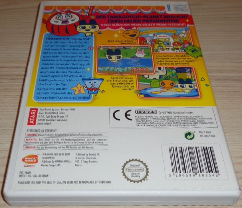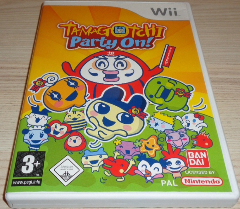 Tamagotchi® Party On! ist ein 3-D-Partyspiel, das auf den allseits bekannten Tamagotchi-Produkten basiert. Der Spieler kann entweder alleine an den Start gehen oder mit bis zu drei Freunden darum wetteifern, das beliebteste Tamagotchi des Tamagotchi-Planeten zu werden. Mit der Wii™-Fernbedienung wird der ganze Planet zu einem Spielbrett! Die Spieler können ihr Lieblingstamagotchi auswählen und einen aberwitzigen Wahlkampf starten: Wer wird der nächste Präsident des Tamagotchi-Planeten? Fröhlich sein! Beliebt sein! Präsident sein!