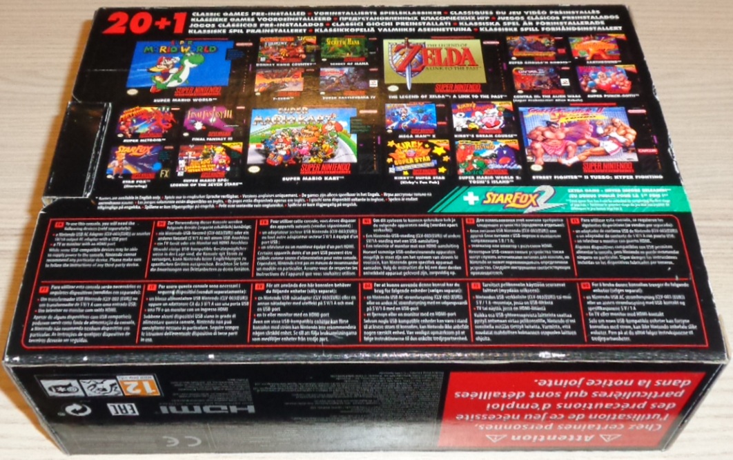 Nach allen Massstäben, die man an Videospiele anlegen kann, handelt es sich bei jedem dieser Titel um einen Klassiker. Einige waren der Ausgangspunkt von Spielserien, die sich bis heute grösster Beliebtheit erfreuen. Auch umfangreiche Rollenspiele sind dabei, die für dutzende Stunden voller Spielspass sorgen, beispielsweise Secret of Mana, Final Fantasy III, EarthBound und Super Mario RPG: Legend of the Seven Stars. Selbst für alte Super Nintendo-Hasen, die schon oft in diese 16-Bit-Spielwelten eingetaucht sind, hat die Mini-Konsole mit Star Fox 2 noch eine Neuheit zu bieten - und eine kleine Herausforderung zugleich. Denn nur wer den ersten Level des Original-Star Fox schafft, das in Europa unter dem Namen Starwing veröffentlicht wurde, spielt sich damit den Zugang zu Star Fox 2 frei.