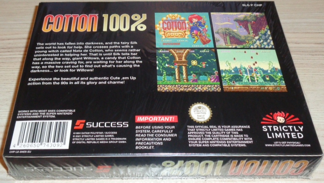 IMPORTANT: This cartridge is the 50 Hz version of Cotton 100%, compatible with the PAL SNES consoles and similar hardware. It will display a smaller display area than NTSC consoles. We are using the highest quality boards available, to ensure the game works with your hardware and doesn't cause any damage to your console.