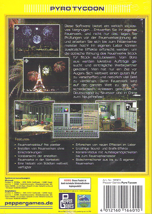 Diese Software bietet ein wirklich explosives Vergnügen! Entwerfen Sie Ihr eigenes Feuerwerk und nicht nur das, legen Sie Prüfungen vor der Feuerwerker-Innung ab, und arbeiten Sie sich bis zum Feuerwerksmeister hoch! Im eigenen Labor können zusätzliche Effekte erforscht werden, um die optische Wirkung des Feuerwerks Stück für Stück aufzubessern. Vom Büro aus werden lukrative Aufträge gesucht und einträgliche Werbepartner geködert. Man hat nur ein Ziel vor Augen: Sich weltweit einen guten Ruf zu verschaffen und natürlich viel Geld zu verdienen. Denn Feuerwerk wird auf der ganzen Welt zu den verschiedensten Anlässen gezündet.