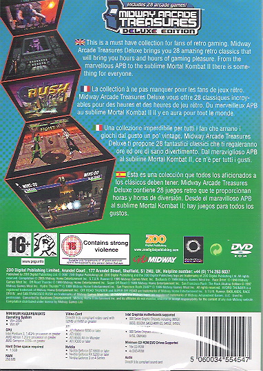 In "Midway Arcade Treasures Deluxe Edition" für PC sind enthalten: A.P.B. Arch Rivals Championship Sprint Cyberball 2072 Gauntlet 2 Hard Drivin' Kozmik Kroozr' Mortal Kombat II Mortal Kombat III NARC Pit Fighter Primal Rage Rampage World Tour Spy Hunter 2 Timber Total Carnage Wacko Wizard of Wor Xenophobe Xybots Badlands Hydro Thunder Off Road Thunder: Mud, Sweat 'N Gears Race Drivin' Rush: The Rock San Francisco Rush 2049 S.T.U.N. Runner Super Off Road.