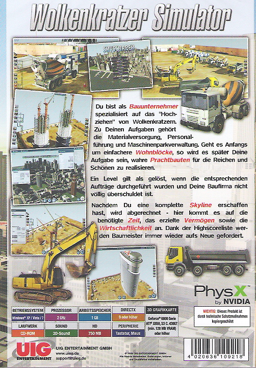 Du bist Bauunternehmer und hast Dich spezialisiert auf das "Hochziehen" von Hochhäusern. Mit der Zeit spezialisierst Du Dich immer weiter und erhälst neue Aufträge für immer höhere Wolkenkratzer auf der ganzen Welt. Zu Deinen Aufgaben gehört die Planung sowie die Versorgung der Baustelle mit Material sowie teilweise sogar das Führen der Baumschinen wie Kräne, Stapler und Trucks. Geht es Anfangs noch um mehrstöckige Stadthäuser so wird es später Deine Aufgabe sein, wahre Prachtbauten für die Reichen und Schönen zu realisieren.