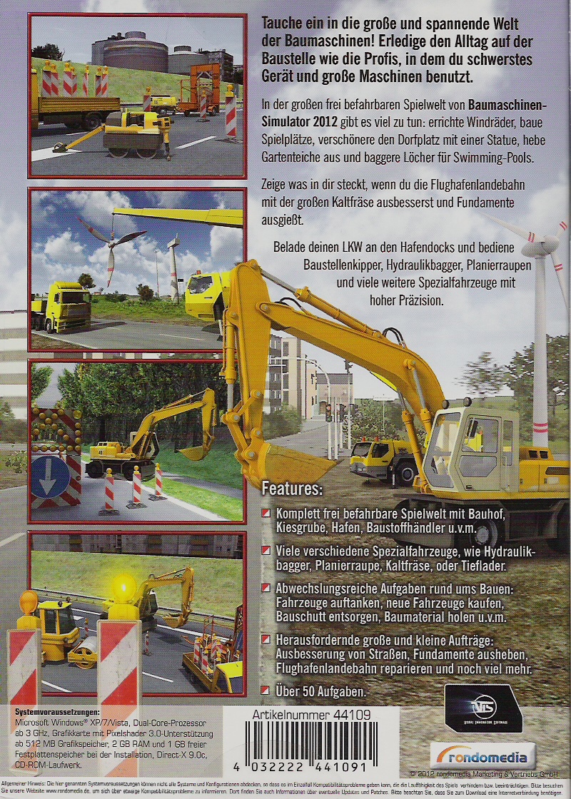 Tauche bei dieser Simulation in den spannenden Alltag einer Baufirma ein und bediene in abwechslungsreichen Missionen viele detailliert dargestellte Spezialfahrzeuge! In der grossen frei befahrbaren Spielwelt von Baumaschinen-Simulator 2012 gibt es viel zu tun: Baue Strassen, Hotels, Luxusvillen oder ganze Feriensiedlungen, um ein verschlafenes Nest zu einem mondänen Badeort zu entwickeln, der viele Touristen anlockt. Der Ausbau der Infrastruktur mit Mobilfunkmasten und der Anschluss ans Kabelnetz dürfen dabei natürlich nicht vergessen werden.