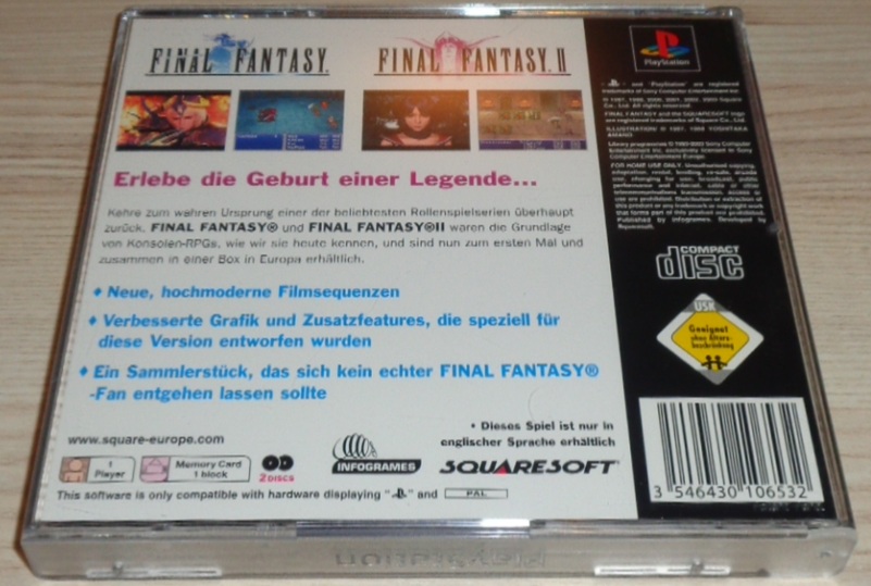 Kehren Sie zum wahren Ursprung einer der populärsten RPG-Serien aller Zeiten zurück! FINAL FANTASY und FINAL FANTASY II haben RPGs, wie wir sie heute kennen, immens beeinflusst und sind nun für die PlayStation zusammen zum ersten Mal in Europa erhältlich. In FINAL FANTASY kontrollieren Sie die vier Krieger des Lichts, die alle einen mysteriösen Kristall mit sich tragen, in ihrem Kampf gegen ein abgrundtief böses Wesen, das versucht die Weltherrschaft an sich zu reißen.