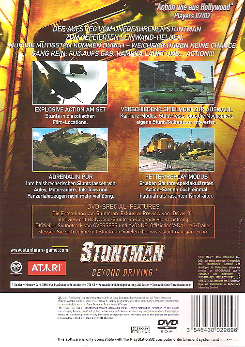 Explosive Action am Fimset: Stunts in sechs verschiedenen Film-Locations (z.B. London, Lousiana, Bankog, Ägyten...) mit individuellen Aufgaben. Zwei Spielmodi: Der Mission-Modus mit Aufträgen und einer spannenden Story und der Arcade-Modus mit einer Stunt Arena und kleineren Spielen. Lernen Sie unterschiedliche Autos zu fahren: gepanzerte Wagen, Tuk-Tuks etc. Replay-Modus: ein Film-Trailer mit Soundtrack und Charakteranimationen zeigt die erfolgreichen Action-Szenen. Treten Sie der Stuntdriving Weltmeisterschaft bei: Messen Sie sich mit anderen Spielern auf der Stuntman-Webseite (www.stuntman-game.com). Bonusmaterial auf der DVD: The Making of Stuntman, Driver III Exclusiv-Trailer, Interview mit Vic Armstrong, offizieller Soundtrack.