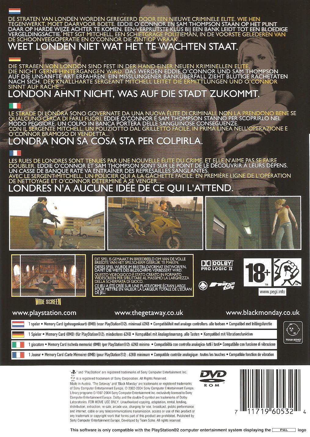 The Getaway: Black Monday folgt dem mit Platin ausgezeichneten Vorgänger The Getaway nach und führt den Spieler wieder in ein lebendiges aber düsteres London mit verstopften Straßen voller Autos und Motorräder. Inmitten dieses urbanen Molochs fernab von Big Ben und Wachablösung nimmt der Spieler an drei Schicksalen teil: dem des MET-Polizisten Mitchell, des Boxers Eddie und dessen Gefährtin, der Diebin Sam. Der Spieler erlebt zwei Geschichten aus drei Perspektiven: Verbrechen, Rache und Vergeltung ziehen ihn in einen Strudel der Ereignisse. Die Straßen von London sind fest in der Hand einer neuen kriminellen Elite, die nicht gerne Hintergangen wird. Das werde Eddie O'Connor und Sam Thompson auf die unsanfte Art erfahren. Ein misslungener Banküberfall zieht blutige Rachetaten nach sich. Der knallharte Sergeant Mitchell leitet die Ermittlungen und O'Connor sinnt auf Rache. London ahnt nicht, was auf die Stadt zukommt.