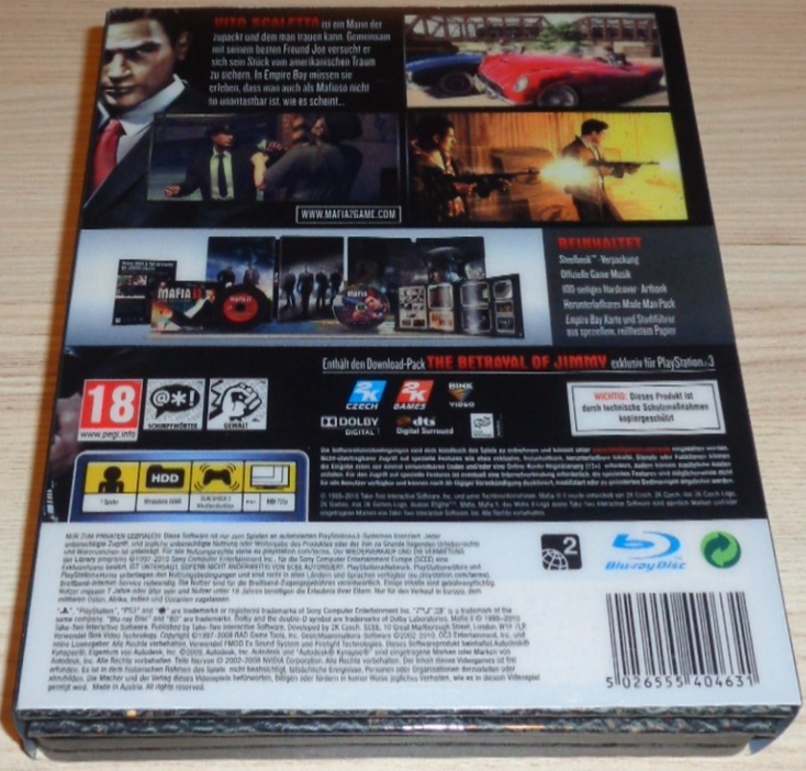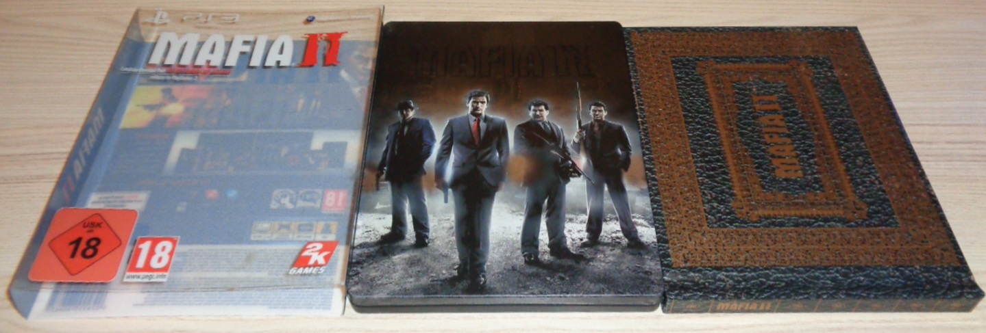 Die Mafia II Collector’s Edition für PS3 ist die limitierte Sammleredition des Gangster-Actionspiels Mafia II. Sie umfasst neben dem Hauptspiel eine hochwertige SteelBook-Sammlerbox mit Motiv der Hauptcharaktere sowie mehrere exklusive Bonus-Items: ein 100-seitiges Hardcover-Artbook mit Konzeptzeichnungen und Illustrationen, die offizielle orchestrale Soundtrack-CD, eine Spielwelt-Karte von Empire Bay und ein Code (evt. nicht mehr gültig) für das „Made Man Pack“, das im Spiel zusätzliche klassische Autos und elegante Anzüge freischaltet. Auf der PS3-Version ist zudem oft der DLC (evt. nicht mehr gültig) The Betrayal of Jimmy enthalten.