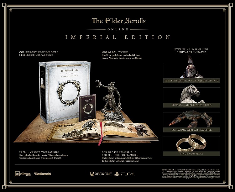 Hochwertiges Steelbook für Sammler Exklusive Sammlung digitaler Inhalte: Spielen Sie als Kaiserlicher: Werden Sie ein Kaiserlicher und schliessen Sie sich jeder beliebigen Allianz an. Erhalten Sie einzigartige Boni, Handwerksfähigkeiten, Ausrüstung und mehr. Weisses kaiserliches Pferd: Rufen Sie dieses kaiserliche Reittier und reisen Sie schneller durch Tamriel. Schlammkrabbe als Haustier: Erforschen Sie Tamriel mit diesem exklusiven Haustier, das Sie auf Ihren Reisen begleiten wird. Ringe von Mara: Schliessen Sie den Bund der Mara und erhalten Sie einen Erfahrungsbonus, wenn Sie gemeinsam unterwegs sind.