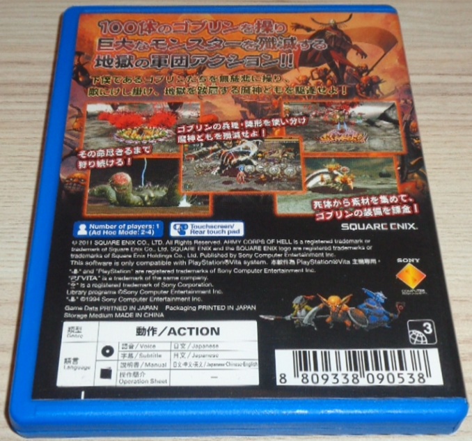 Kommandiere eine riesige Goblin-Armee. Löschen Deine Feinde aus, indem Du sie mit hunderten Goblin-Soldaten bekämpfst, die allesamt verschiedene Klassen und Fähigkeiten bieten. Stelle die Macht des Höllen-Königs wieder her, führe Deine Goblin-Armee gegen grausame Feinde in die Schlacht und setze den rechtmäßigen Herrscher der Unterwelt wieder auf seinen Thron. Entfessele die Kräfte der PlayStation®Vita Benutze das Touch-Pad auf der Rückseite der PlayStation Vita, um den Goblins zu befehlen ihre Instrumente zu spielen. Erwecke so Deinen Helden wieder zum Leben, regeneriere Dich oder treibe die Goblin-Horden mit dem Klang der Kriegstrommeln an. Geschicktes musizieren wird mit Boni und einer höheren Überlebenschance gegen die dämonischen Horden belohnt. Ernte die Früchte des Sieges und rüste Deine Truppen aus Kombiniere Materialien, die gefallene Feinde hinterlassen und schmiede aus ihnen neue Ausrüstungs-Gegenstände für Deine Goblin-Krieger. Rüste Deine Truppen aus und verändere so ihre Fähigkeiten und Erscheinungsbild. Verbünde Dich mit Freunden Spiele mit bis zu drei Freunden via Ad-hoc-Verbindung und trete gegen die stärksten Boss-Gegner an, um seltene Gegenstände zu erbeuten.