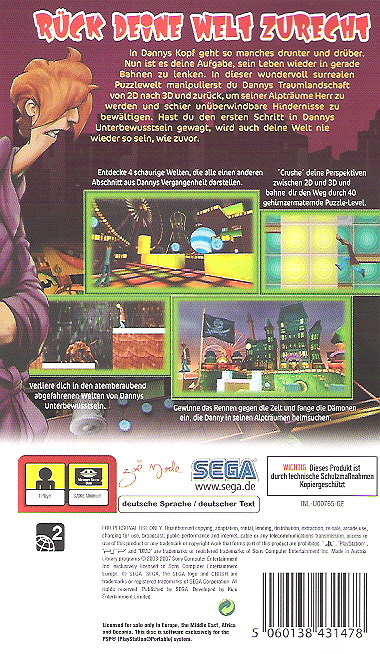 Die einzigartige „CRUSH“-Mechanik ermöglicht es Spielern, ständig zwischen 2D und 3D-Umfeldern zu wechseln. 40 intelligent gestalteter Puzzlelevel bringen die Hirne von Profi- und Gelegenheitsspielern auf Hochtouren. Surreale Umgebungen und eine packende Storyline sorgen für eine einzigartig durchdachte und faszinierende Gameplay-Erfahrung. Eine komplett neue Spielerfahrung - exklusiv für PSP.