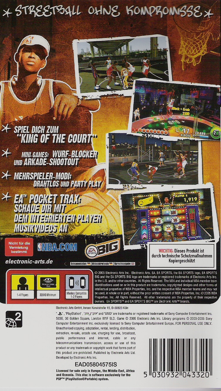 Wer hat das Sagen auf der Straße? Der Spieler tritt gegen die größten Stars der NBA an - aber auf der Straße. Er kann 3 on 3-Spiele austragen oder sich der ultimativen Herausforderung stellen und zur Legende werden. Erstellen eines eigenen Streetballers: Dem Spieler stehen unzählige Gestaltungsmöglichkeiten zur Verfügung - und dann heißt es, seinen eigenen Spieler im King of the Cours-Modus auf die Straße zu schicken. Zwei einzigartige Modi: In den Modi Shot-Blocker und Arcade-Shootout geht es darum, seinen Status als Street-Legende zu unterstreichen. Multiplayer: Pickup-Spiele können auch gegen einen Freund ausgetragen werden. Party Play: Bis zu vier Spieler können in den beiden atemberaubenden Modi Shot-Blocker und Arcade-Shootout über eine PSP gegeneinander antreten. EA Pocket Trax: Dieses neue Feature, das speziell für die PSP entwickelt wurde, ermöglicht es dem Spieler, sich Musik anzuhören und anzuschauen.