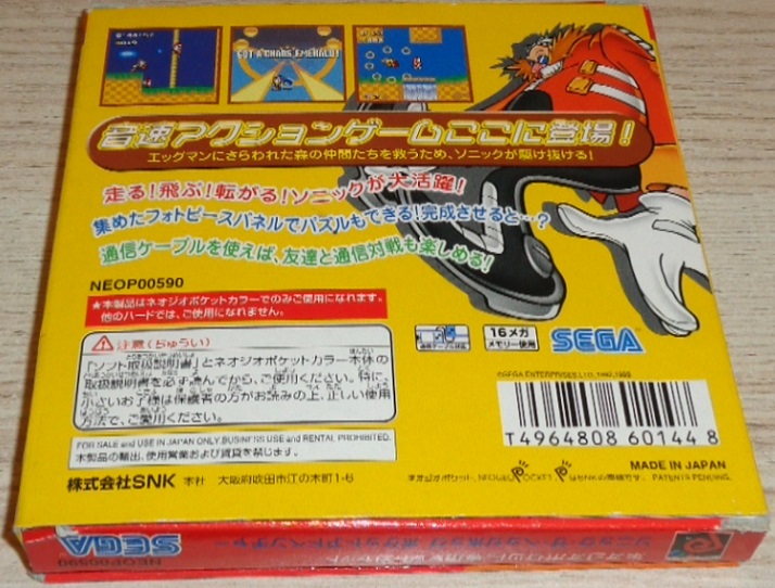Hilf Sonic in Sonic Pocket Adventure Für Neo Geo Pocket Color, seine Waldfreunde vor dem bösen Dr. Robotnik zu retten. Schnapp Dir dazu die goldenen Ringe und sammle alle Chaos Smaragde für besondere Boni. Stürze Dich durch mehrere Bonuslevels und fordere den Highscore Rekord heraus. Sammle Puzzleteile und vervollständige das mysteriöse Foto. Spiele gegen einen Freund in einem 2-Spieler Vs.-Kampf.