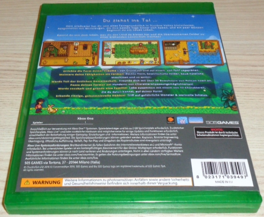 Verwandeln Sie ein überwuchertes Feld in eine lebendige Farm. Züchten Sie Tiere, bauen Sie Feldfrüchte an, pflanzen Sie einen Obstgarten, stellen Sie nützliche Maschinen her und vieles mehr. Verbessern Sie mit der Zeit Ihre Fähigkeiten. Auf dem Weg vom Greenhorn zum Meisterfarmer durchlaufen Sie fünf verschiedene Stufen: Feldbau, Bergbau, Kampf, Angeln und Nahrungssuche. Werden Sie Teil der örtlichen Gemeinschaft. Über 30 einzigartige Charaktere leben in Stardew Valley, jeder mit eigener täglicher Routine, Geburtstag, Mini-Filmsequenz und Gesprächsstoff für jede Woche im ganzen Jahr. Erkunden Sie eine riesige, geheimnisvolle Höhle. Treffen Sie auf Ihrer Reise in die Tiefe auf neue und gefährliche Monster, mächtige Waffen, neue Umgebungen, wertvolle Edelsteine und andere Schätze. Hauchen Sie dem Tal neues Leben ein. Verhelfen Sie Stardew Valley wieder zu Ruhm, indem Sie das alte Gemeindezentrum reparieren. Oder gehen Sie einen anderen Weg und schliessen Sie sich mit der Joja Corporation zusammen. Finden und heiraten Sie einen Partner, mit dem Sie Ihr Leben auf der Farm verbringen. Es stehen 10 Junggesellen und Junggesellinnen zur Verfügung, alle mit einzigartigen Charakterentwicklungs-Filmsequenzen. Verbringen Sie einen entspannten Nachmittag am Angelplatz. Die Gewässer sind voller saisonal unterschiedlicher, köstlicher Fische. Stellen Sie Köder und Krabbenkörbe her, die Ihnen zum grössten Fang und damit zu lokalem Ruhm verhelfen. Fertigen Sie Köder, Schwimmer und Reusen, die Ihnen dabei helfen, jeden Fisch zu fangen und zur lokalen Legende zu werden!