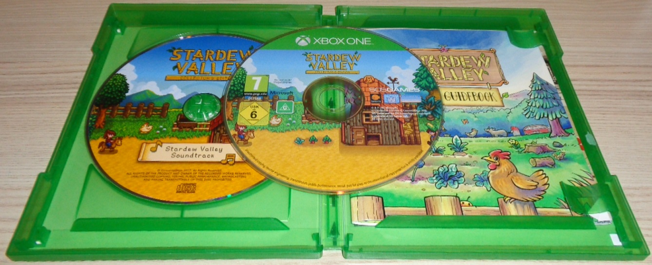 Stardew Valley Spiel. Eine Karte von Pelican Town. Ein Mini-Guidebook. Den offiziellen Soundtrack auf CD.