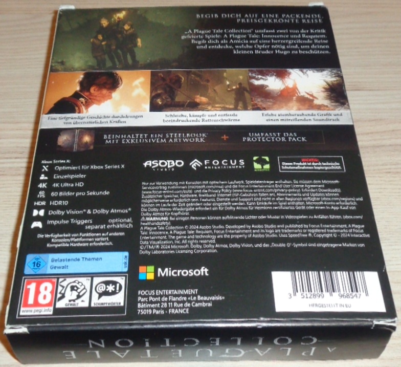 Ein düsteres Third-Person Abenteuer, im pestverseuchten Frankreich des 14. Jahrhunderts. Führen Sie die Waisenkinder Amicia und Hugo durch die Schatten an tödlichen Feinden, sowohl Menschen als auch unnatürlichen Rattenschwärmen, vorbei. Manipulation der Ratten, um sie gegen die Inquisition einzusetzen Atemberaubende Grafiken und eine fesselnden Inszenierung erwecken eine alptraumhafte Vision des Mittelalters zum Leben. Professionelle Schauspieler hauchen ihren Sprechrollen Leben ein. Soundtrack aus der Feder von Olivier Deriviére (u.a. Vampyr, 11-11 Memories Retold)